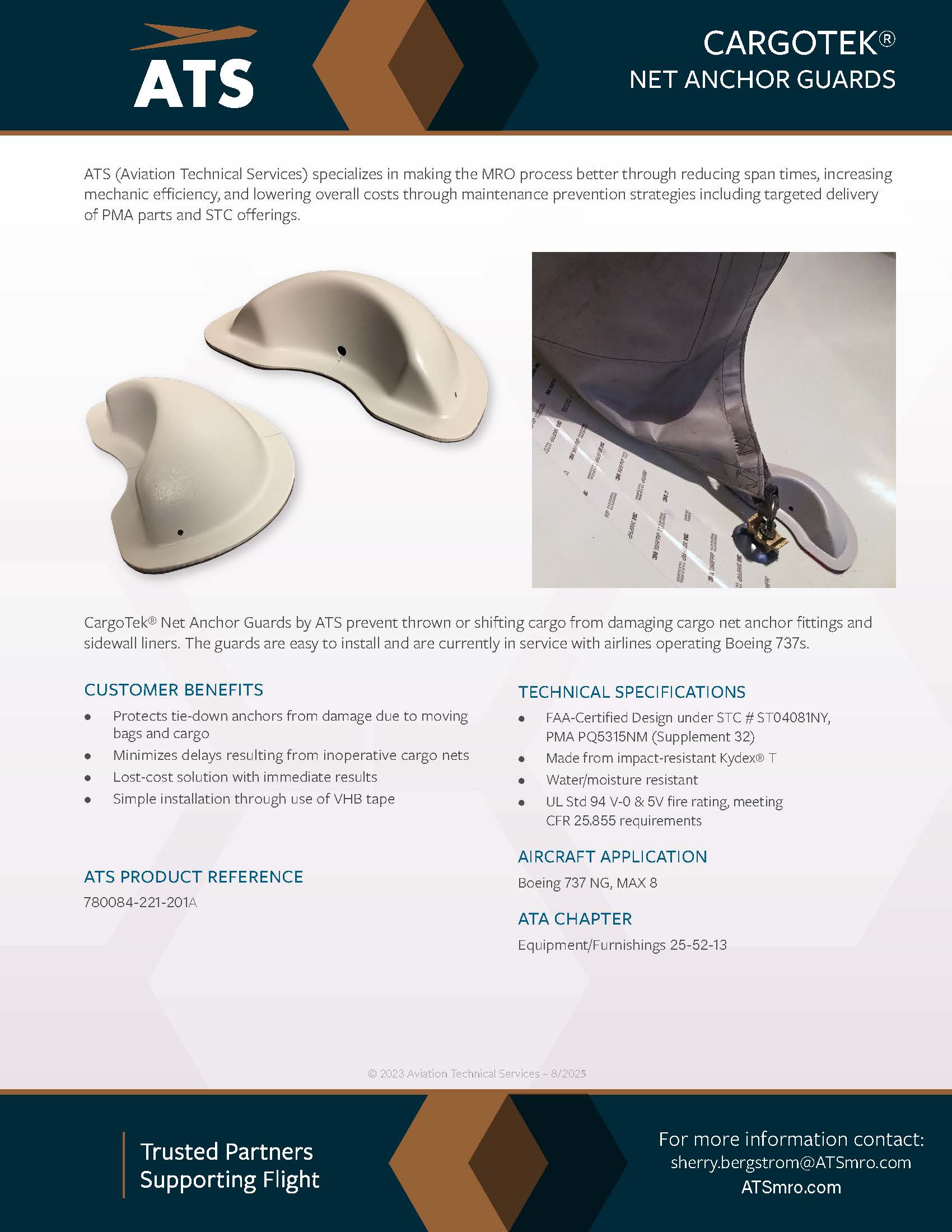 Cargo Bay Net Anchor Guards by ATS prevent thrown or shifting cargo from damaging cargo net anchor fittings and sidewall liners. The guards are easy to install and are currently in service with airlines operating Boeing 737s